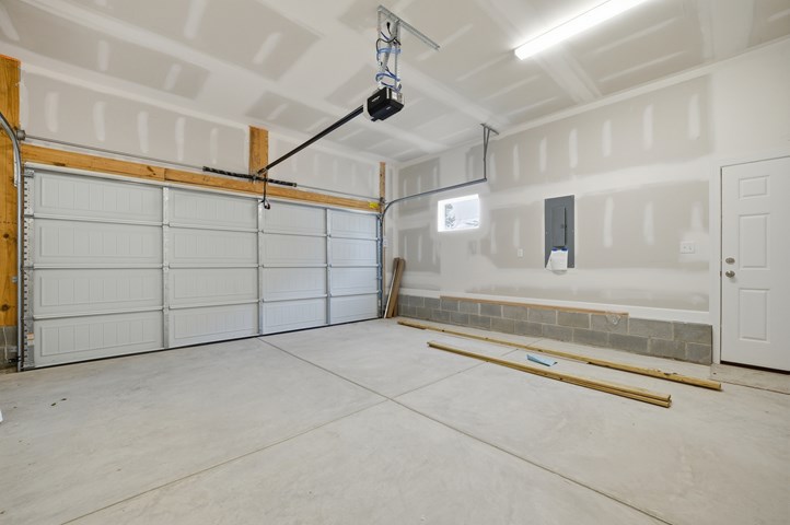 - A carriage-style, raised-panel garage door with remote and opener