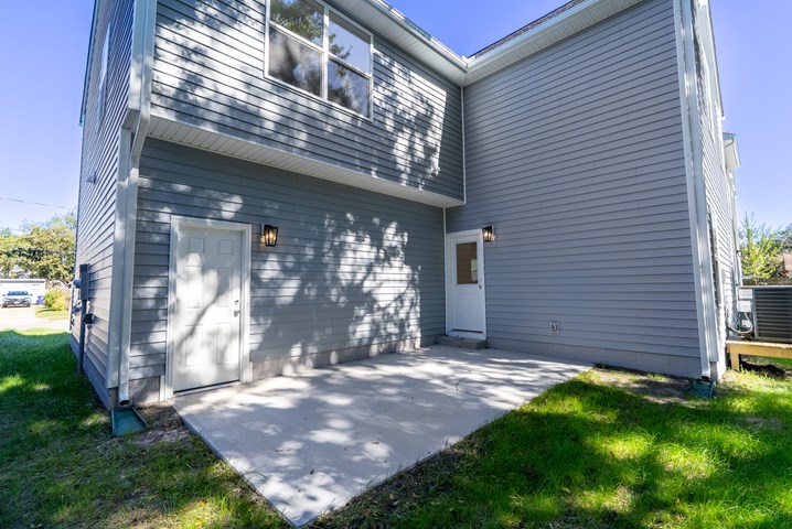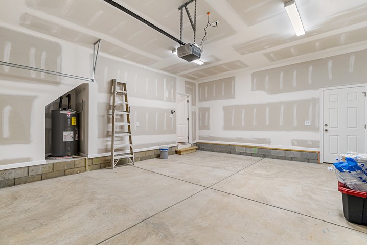 - A carriage-style, raised-panel garage door with remote and opener