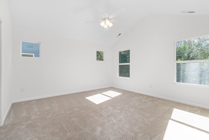 - A master bedroom with a vaulted ceiling and walk-in closet