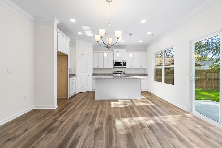 - Custom-designed kitchen cabinetry with soft-close cabinets and drawers and extensive crown molding
