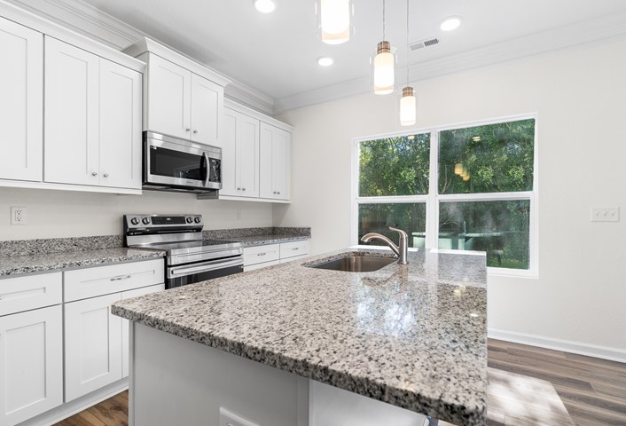 The Dean Model features four large bedrooms including a first floor bedroom or office, three bathrooms, a gourmet kitchen with dining area which opens up to a living room, a two-car garage, laundry room and a private deck/patio off the kitchen. The master bedroom retreat features a large en suite bathroom with a picture window, stand-up shower with glass door and large walk-in closet. On the outside, you’ll love the architectural charming accents along with a private deck off the kitchen to enjoy on those beautiful days and nights.