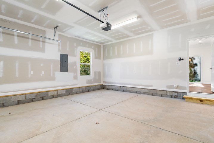 - A carriage-style, raised-panel garage door with remote and opener