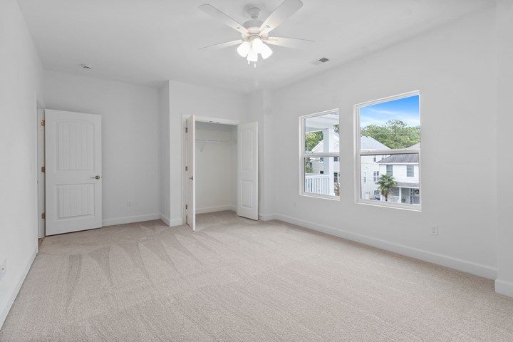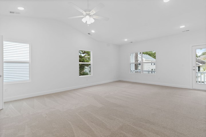 - A master bedroom with a vaulted ceiling and large walk-in closet